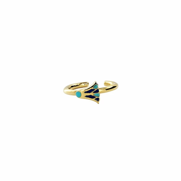 Ce bijou s’inspire d’une bague dite Bague aux lotus (Nouvel Empire, vers 1565-1085 avant J.-C. Or, lapis-lazuli, turquoise, cornaline – Musée du Louvre, Paris).