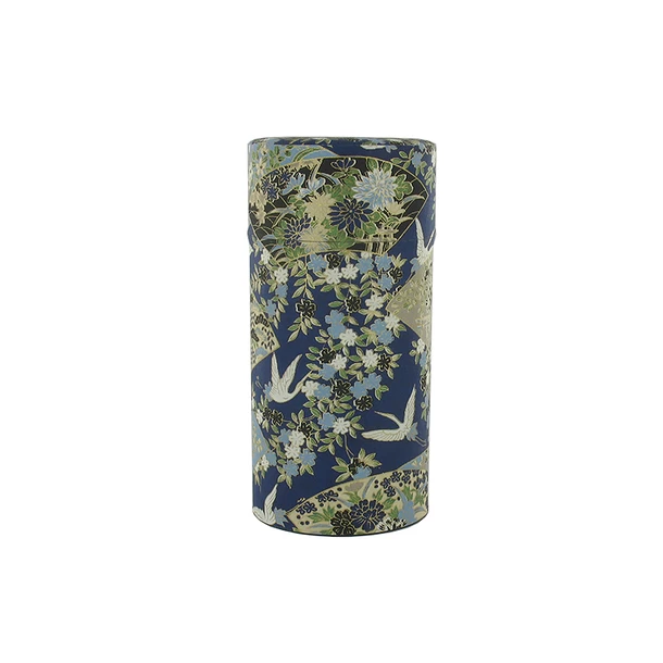Boîte à thé en métal et papier avec un motif traditionnel japonais.