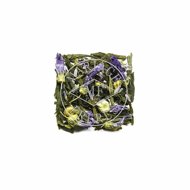 Ce thé vert parfumé d’épices douces et de fleurs blanches est parsemé de pétales de mauve qui évoquent les ciels indigo des impressionnistes.