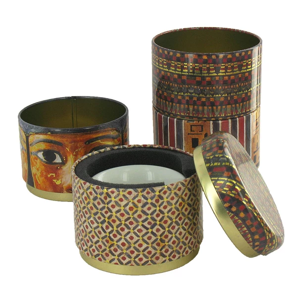 Ensemble de quatre tasses avec boîte en métal aux couleurs de l’Égypte antique. Personnalisez la boîte au gré de vos envies en changeant la position des compartiments !