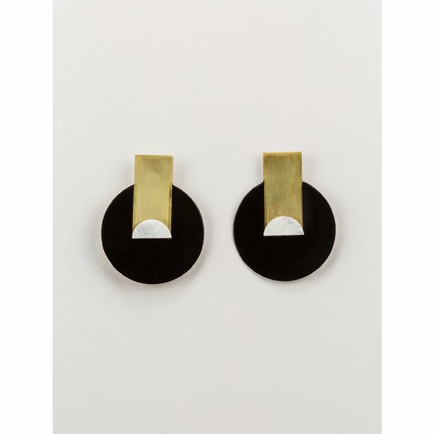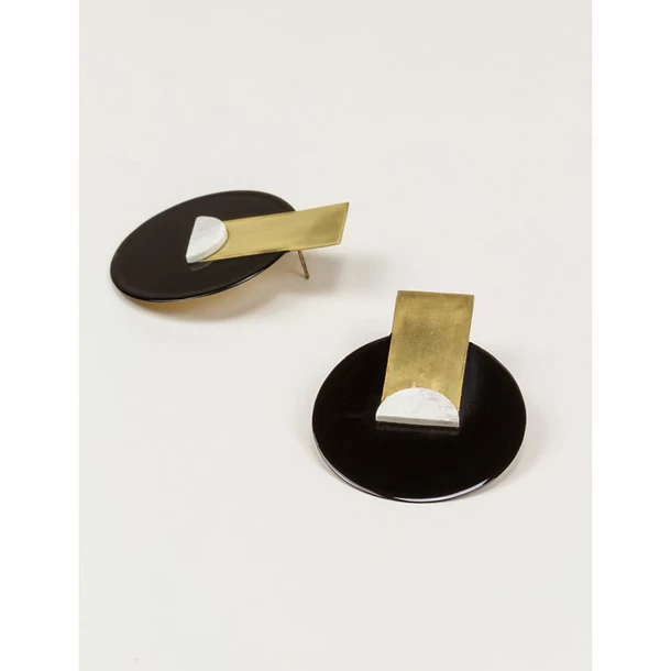 Boucles d’oreilles en laiton, pierre et laque noire qui s’inspirent du métissage architectural au Vietnam durant la période art déco.