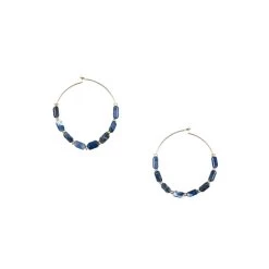 Ces boucles d’oreilles en sodalite et laiton doré s’inspirent des parures des civilisations antiques égyptiennes et mésopotamiennes faites de perles de faïence ou de lapis-lazulis.