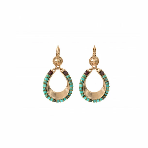 Succombez au style bohème chic de la collection Ninon qui unit au métal doré à l’or fin de véritables pierres de couleur. Ces boucles d’oreilles dormeuses s’habillent de turquoise, pierre de protection des voyageurs et de grenats facettés. Des sequins métalliques dorés soulignent l’élégance de ces dormeuses.