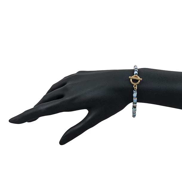 Ce bracelet en perles de fluorite, sodalite et laiton doré est inspiré d’un collier dit de Bactriane avec des petites perles cylindriques en lapis lazuli associées à trente perles en or et à un pendentif en forme de tige portant deux disques (Bactriane, -2100 / -1900 (2e moitié IIIe mill av. J.-C. (?)).