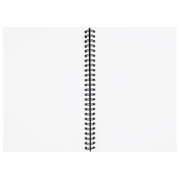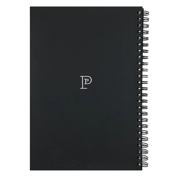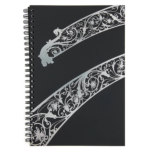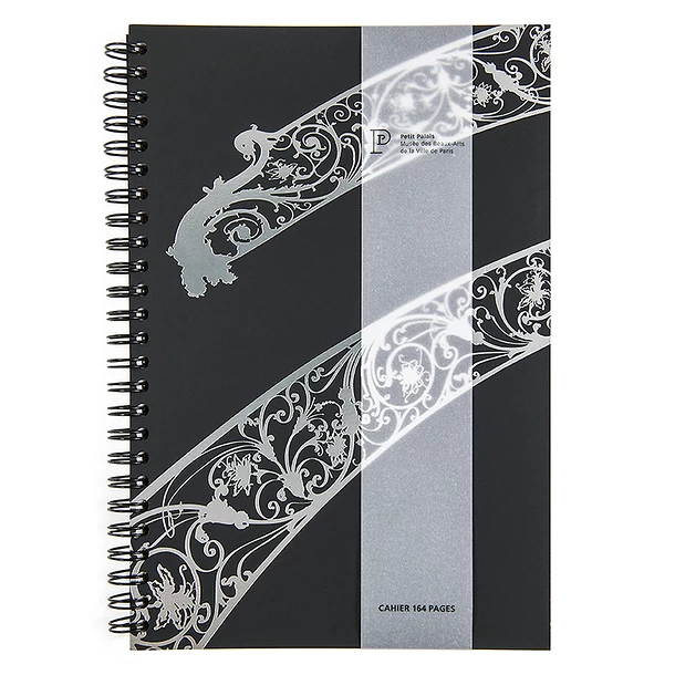 Cahier à spirale, 15 x 22 cm – 164 pages blanches – Papier vélin Distinction Douceur 90 g/m² de la manufacture Lana, maître papetier depuis 1590 – Couverture imprimée dans les ateliers parisiens Créanog, spécialisés en gaufrage et marquage à chaud sur papier de création Curious Skin teinté masse, noir 300 g/m² d’Arjowiggins – Fabriqué à partir de pâte sans chlore.