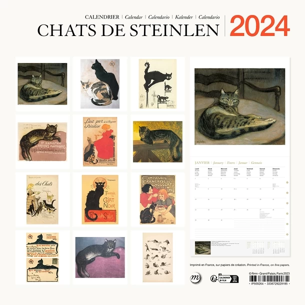 Calendrier 2024 présentant 12 œuvres de l’artiste Théophile Alexandre Steinlen (1859-1923) sur la thématique du chat.