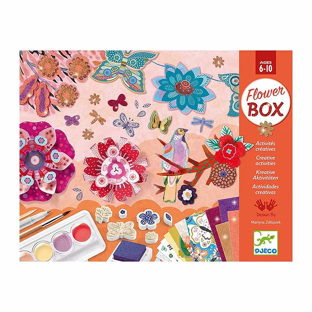 Ce coffret propose 6 activités créatives et de nombreux projets sur le thème des fleurs : peinture, dessin, collage, pliage, cartes à gratter et saynètes en 3D. Il y en a pour tous les goûts ! Des heures d’activités manuelles pour découvrir différentes techniques de création et s’immerger dans un jardin fleuri. Tous les accessoires sont fournis pour que l’enfant réalise chacune des activités au rythme de ses envies et de sa curiosité. Le livret détaillant pas à pas chacune des réalisations le guidera dans ses créations.