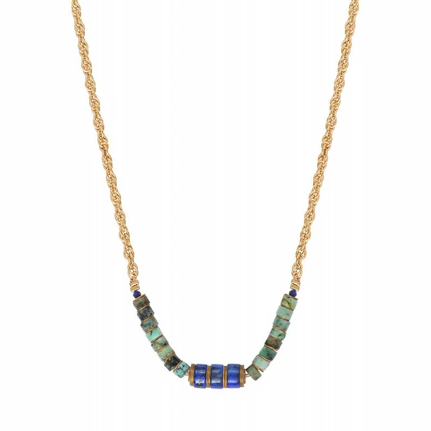 La turquoise et le lapis lazuli s’associent pour composer cet élégant bijou femme. Ce collier court en pierres de couleur et métal doré à l’or fin apportera à toutes vos tenues de la saison un style bohème-chic tendance. Grâce à sa fine chaînette, ce collier femme ajustera sa longueur à vos moindres envies.