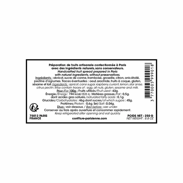 Abricot du Roussillon, framboise Willamette, sucre de canne non raffiné, anis étoilé, citron. Teneur totale en sucre 57%. Préparée avec 60G de fruit pour 40G de sucre de canne non raffiné.