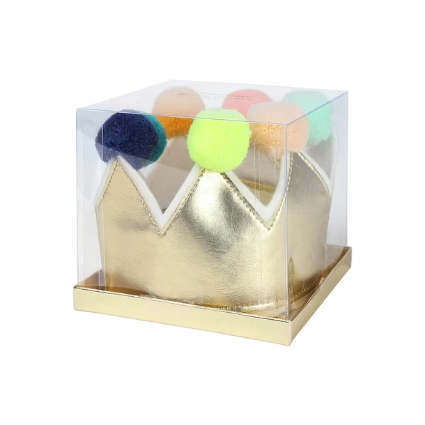 Cette couronne brillante, fabriquée en similicuir et en feutre dorés, comporte sept pompons audacieux et lumineux. Le couvre-chef parfait pour tout petit roi ou petite reine.