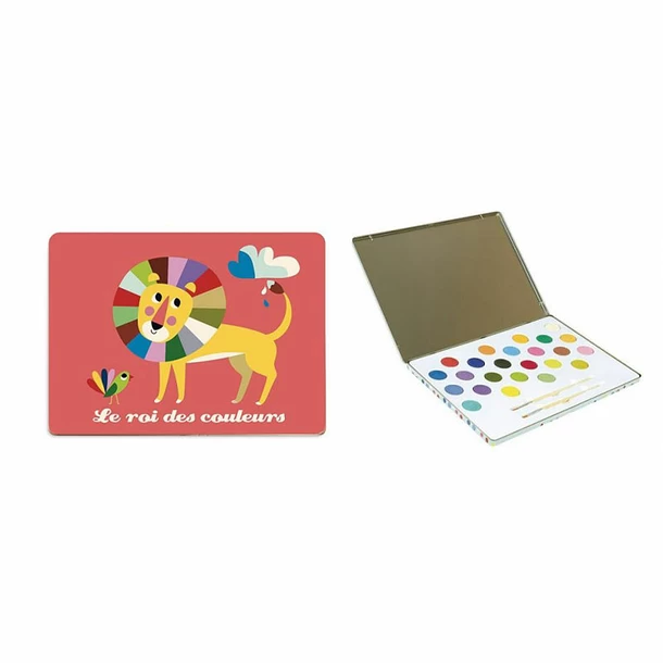 24 pastilles de peinture à l’eau et 2 pinceaux.