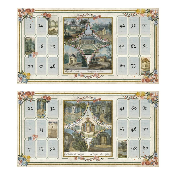 Jeu de Loto sur le thème de Versailles avec des pions en bois et des planches en carton représentant des vues anciennes du château et son domaine.