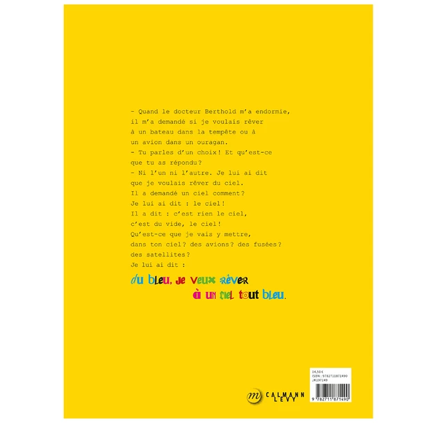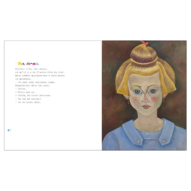 Une fillette raconte à son père ce qu’elle a vu de l’autre côté du ciel quand elle s’est envolée mi-fille, mi-abeille : une ferme comme celle de l’enfance de son père, avec des animaux, une jolie rousse Miss, les colères de Miss, la lune bleue…