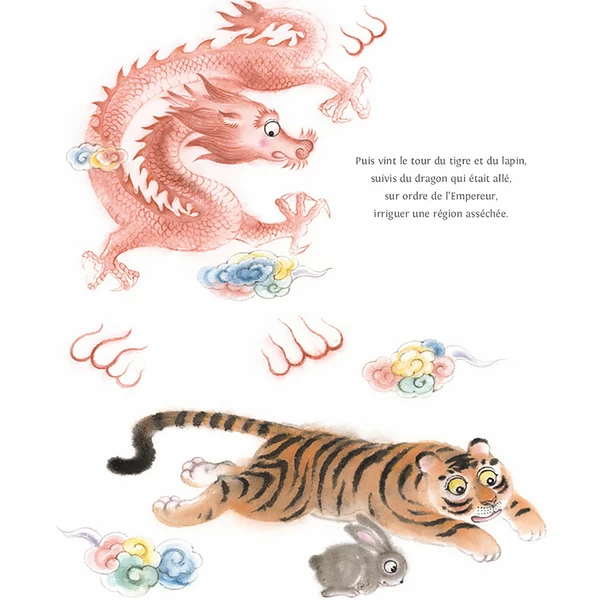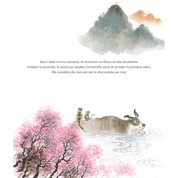 Au temps où l’on ne savait pas encore compter les années, l’Empereur du Ciel organisa une grande course. Les douze vainqueurs devaient chacun représenter une année. Le chat et la souris, bons amis, s’entraidèrent jusqu’au moment où la souris trahit son ami… Depuis, le chat ne figure pas parmi les animaux du zodiaque chinois, et voue une haine éternelle à la souris !