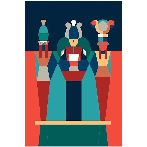 Entre modernité et figuration, cette ligne aux couleurs vibrantes, révèle l’actualité de ces œuvres créées il y a plusieurs millénaires, des détails et objets du quotidien (chevalière, cuiller, bas-relief), des divinités et des symboles de la civilisation égyptienne (la triade Osiris Isis Horus, l’œil oudjat, Anubis, Thot, Bastet), et prolonge les émotions et les sensations ressenties face aux œuvres.