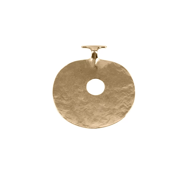 Ce bijou en plaqué or, fabriqué en France, est inspiré d’une pendeloque circulaire (Sardes (Turquie), Royaume Lydien (800-500av. J.-C.); Or) conservée au musée du Louvre.