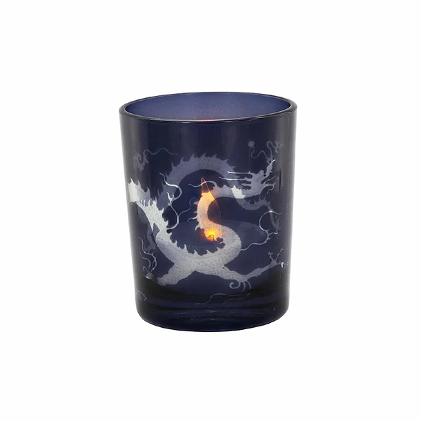 Ce photophore en verre est inspiré d’un détail d’un vase meiping à décor de dragon (Chine, XIVe siècle, dynastie yuan (1279-1368) – Porcelaine. H. 33,6; l. 20,1 cm. Paris, musée national des arts asiatiques Guimet).