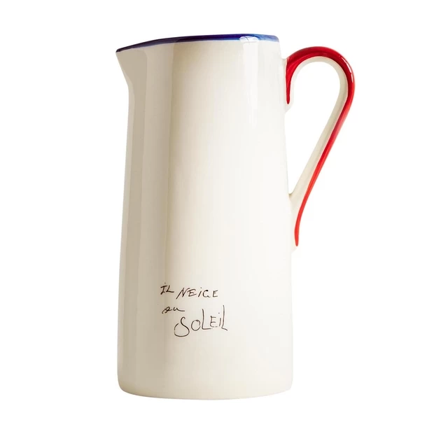 Pichet en faïence orné de détails contrastants et dont le motif est inspiré des manuscrits de Pablo Picasso (1881-1973).