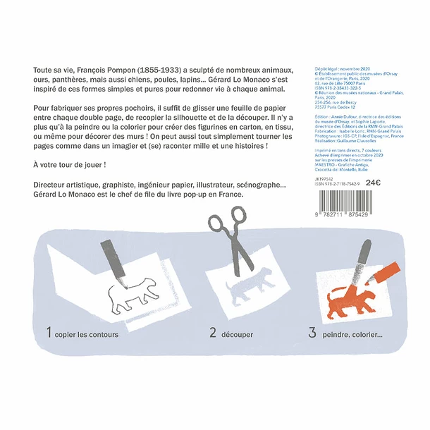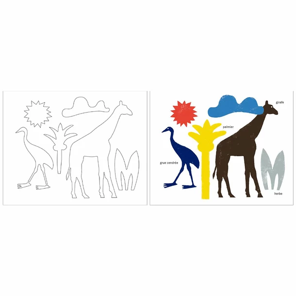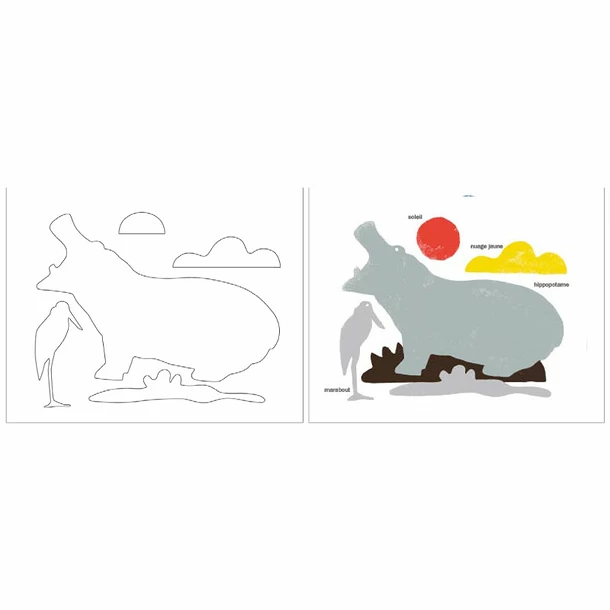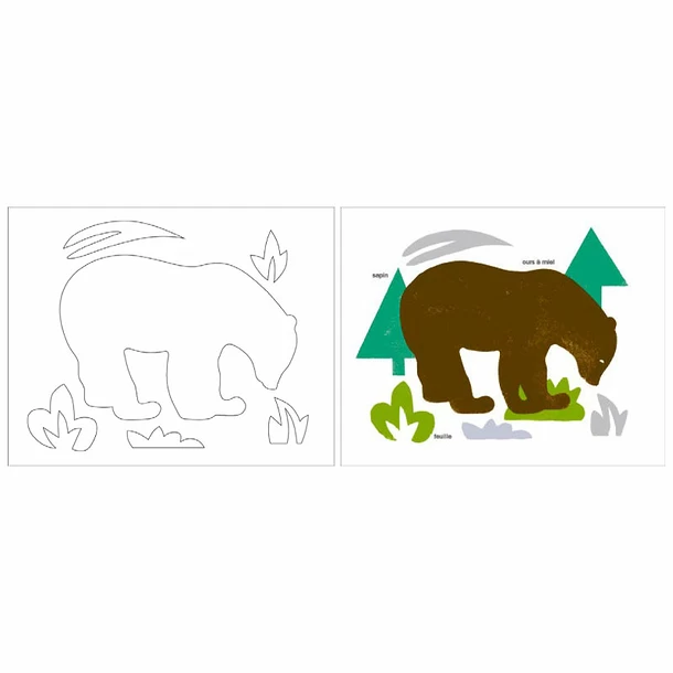 Pour fabriquer ses propres pochoirs il suffit de glisser une feuille de papier entre chaque double-page, de recopier la silhouette et de la découper. Il n’y a plus qu’à la peindre ou la colorier pour créer des figurines en carton, en tissu, ou même pour décorer des murs! On peut aussi tout simplement tourner les pages comme dans un imagier et (se) raconter mille et une histoires!
