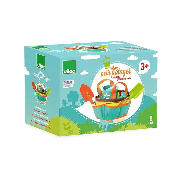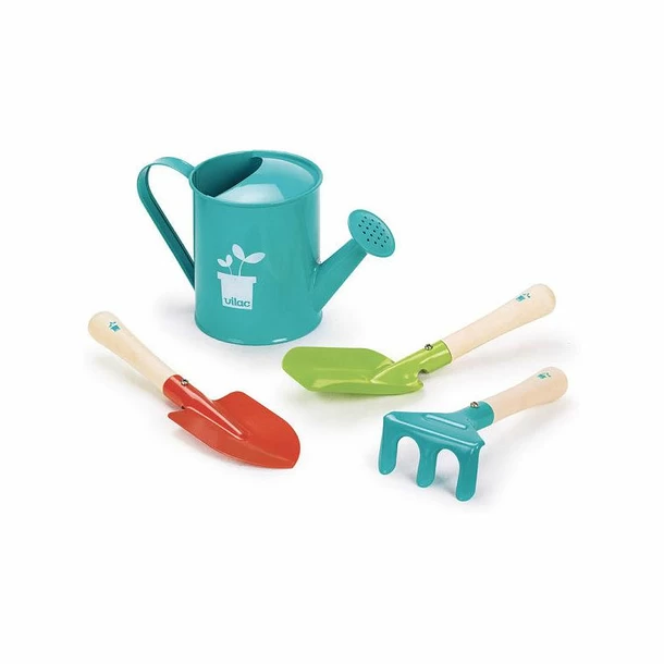 Ce sac de jardinier contient un arrosoir, une pelle, un râteau et une bêche. Voilà un bel ensemble de jardinage pour jouer dans le jardin !