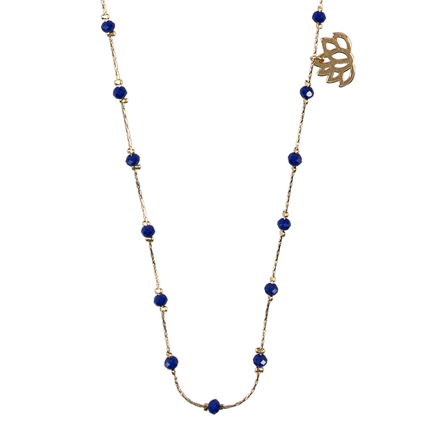 Ce sautoir avec des perles bleu roi et deux pendentifs en forme de nymphéas en étain doré est librement inspiré de la célèbre série des peintures de Claude Monet: Les Nymphéas, réalisée entre 1890 et 1926.