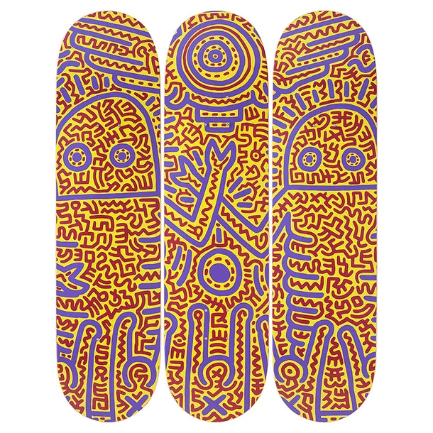 Ce triptyque de skateboards Keith Haring est aussi décoratif que fonctionnel. Les skateboards peuvent être posés ou accrochés au mur, mais aussi ornés de roues et ainsi retrouver leur fonction originelle.