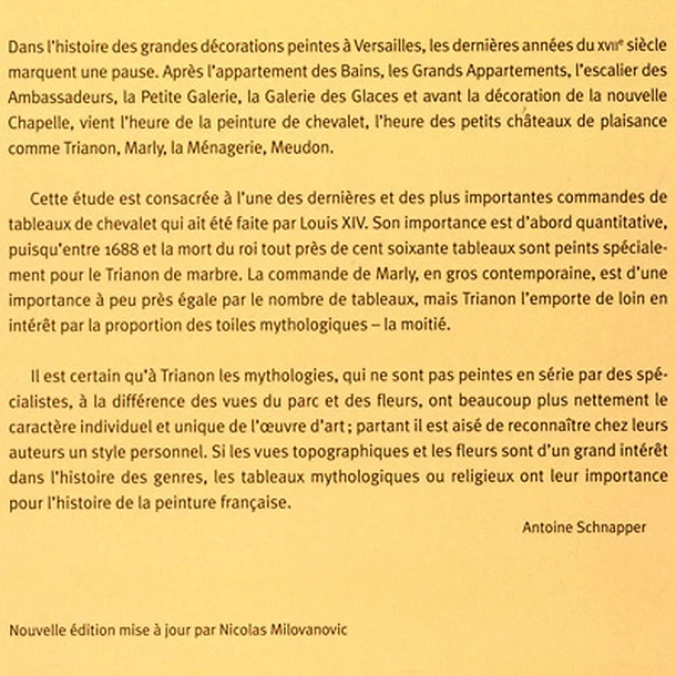 Elle est d’autant plus justifiée que de nombreux tableaux de Trianon ont été remarquablement restaurés. Les emplacements actuels des peintures ont par ailleurs été précisés, ce qui n’avait pas été possible en 1967 car les œuvres revenues à Versailles n’avaient pas encore été remises en place.