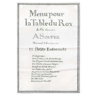 Ce torchon a été réalisé à partir du recueil « Voyages du Roi au château de Choisy, avec les logements de la cour et les menus de la table de Sa Majesté – Année 1747 », par Brain de Sainte-Marie.
