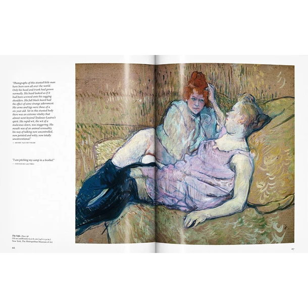 Descendant d’une vieille famille de la noblesse française, Toulouse-Lautrec semble avoir été attiré très tôt par le monde des plaisirs, s’intéressant aux salles de danse, aux cabarets et aux maisons closes de Montmartre, et choisissant comme sujets de célèbres danseuses et chanteuses, telles que Jane Avril. Ses œuvres représentent à la fois des scènes animées de spectacles et des portraits posés et sensibles saisis hors scène, notamment dans Le Sofa ou Le Lit. D’un point de vue stylistique, il maîtrisait autant l’art graphique, comme en témoigne ses affiches publicitaires de Jane Avril, que celui de l’esquisse, dessin libre et pourtant puissamment évocateur.
