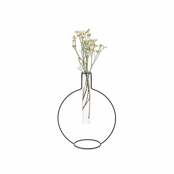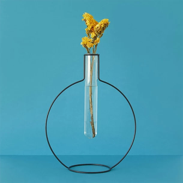 UN CONTENANT EN FORME D’ÉPROUVETTE. L’éprouvette en verre qui constitue le contenant est soutenu par un contour métallique en forme de vase. Le rendu est joli et étonnant